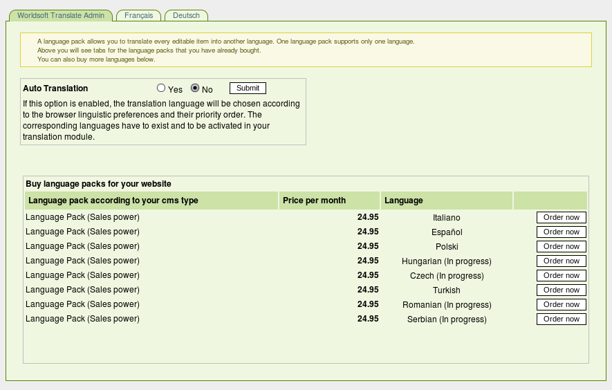 Important: If the "Auto Translation" setting of the Translation Module is set to "No", do not forget to display the Language Selector block to your visitors !
