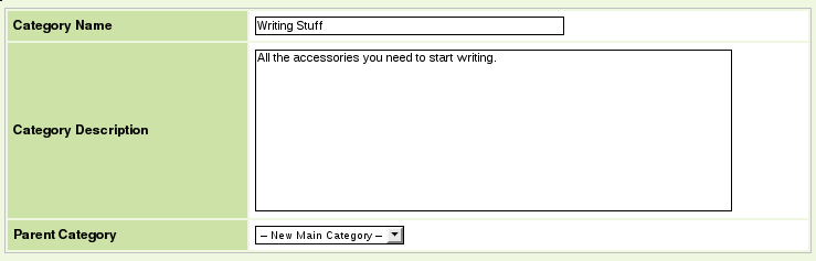 Just enter the Category name and description. You can optionally set a Parent Category if you want to have a hierarchy of categories (for instance: Clothes/Men/T-Shirts). Then, click the "Submit" button.