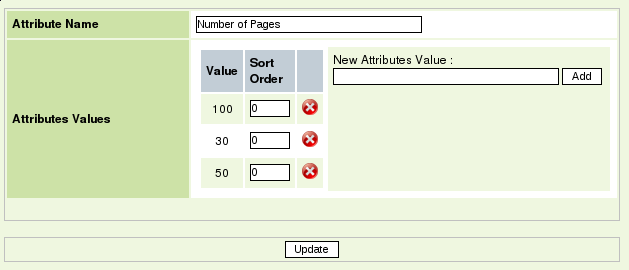 Use the field "New Attributes Value" to type in the possible values (i.e. "30", "50" and "100"). Click Add to save each value. The contents of the tab should look like this: