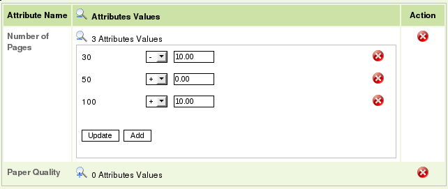 Let's set the Price for the Values of "Number of Pages" Attribute. Click on the "+ Magnifier" symbol at the left of '0 Attributes Values'. The "Add" Button appears: