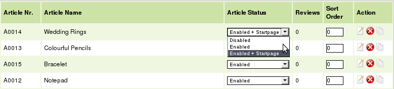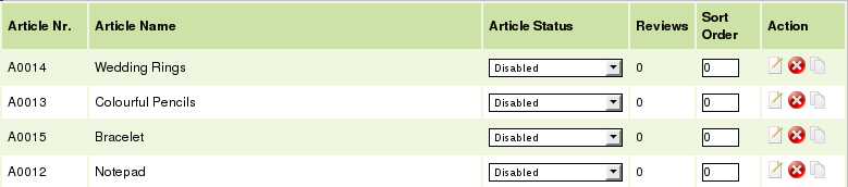 - Article Nr. : As entered in the Article Details - Article Name : As entered in the Article Details - Article Status : Can be Enabled/Enable + Start Page/Disabled. Please see the chapter "Final Configuration : Enabling Articles" for more details. - Reviews : The number of reviews (i.e. Comments) that this Article has received. Moderation is done within the "Comments" CMS-tab. - Sort Order : The order in which the articles shall appear in lists (Ascending order is used) - Action : Using the buttons here, you may Edit, Delete or Clone (i.e. Duplicate) an Article |