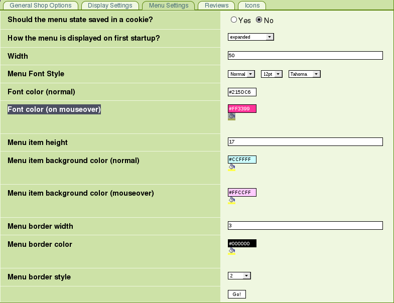 Font color (on mouseover) : Text color when the mouse is located over the item