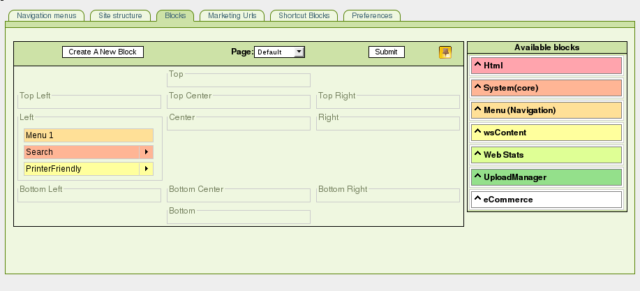 Click on "eCommerce" in the Available Blocks section. You may now drag and drop the following blocks into your navigation: