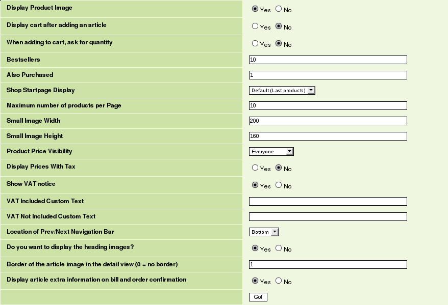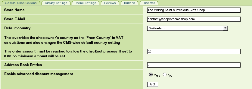 Store Name : Used as the Sender name (i.e. 'From') in the Order Confirmation Email. This is also the Recipient Name of the shop owner's copy of the Order Confirmation Email. Store E-mail : Used as the Sender E-mail (i.e. 'From') in the Order Confirmation Email. This is also the address to which a copy of the Order Confirmation Email will be sent. Default Country : If not set, the Shop will use the Shop owner's Country as the 'From' Country in VAT calculations. If set, the selected country will be used instead. Minimum Order Amount : Sets the minimum Grand Total Net Amount of an Order so that it can be actually confirmed. Address Book Entries : Maximum number of entries allowed in the customer's Address Book Advanced Discount Management : Turns on/off the Advanced Discount Features (i.e. Article-level Discount Policies) |