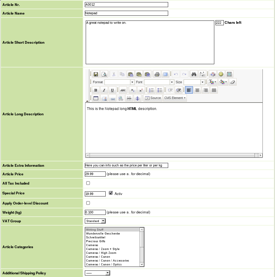 - Article Nr. : Reference of the Article inside your company (ex: A0012) - Article Name : The Name that will be shown to customers - Article Short Description : a simple text field of 250 characters to describe the Article - Article Long Description : a full-featured HTML description which you can create using the WYSIWYG editor. You may for instance insert bullets lists, pictures, and tables here. - Article Extra Information : In the free text field, you may enter extra information about the article, such as the price per liter or per kg. Depending on the Display Settings (see paragraph 3.2), this information can be printed on the bill and order confirmation. - Article Price : The Price of the Article in the Reference Currency (see Billing Management on the Reference/Secondary Currencies topic) - All Tax Included : Specifies if the Price above includes the VAT or not - Special Price : You may want to give the Article a Special Price. If so, enter it here. - Apply Order-level Discount : We will discuss the Discounts later, but this enables you to discount this Article based on the sum of bought Articles net price in an Order. - Weight (kg) : This is used in the Shipping Costs calculation - VAT Group : Here you can choose which VAT Group this Article belongs to (depending on your country, if might not be the same for food, electronics, etc...) - Article Categories : The Category (or multiple Categories) this Article belongs to. - Additional Shipping Policy : Optionally, you can associate an additional Shipping Policy to this article (i.e. "Fragile" for items that need careful handling). We will discuss Shipping Policies later. |