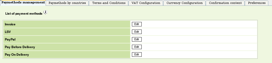 All these settings are accessed from the List of Payment Methods, located in the "Paymethods Management" tab :