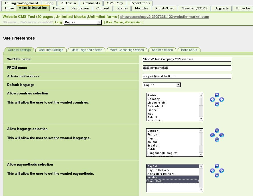 In the part of the Billing Management module, you can configure the various payment methods that are available to your customers. You may, for instance, enable them or disable them on a global basis, or by country. You can also grant discounts for specific payment methods.